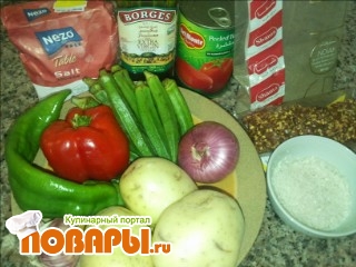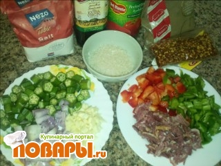 В кастрюле закипятить воду, добавить очищенный и порезанный картофель, Порезать охру и добавить в кастрюлю. Промыть рис и тоже добавить. Через 5 минут переложить содержимое сковороды и копчёное мясо в суп