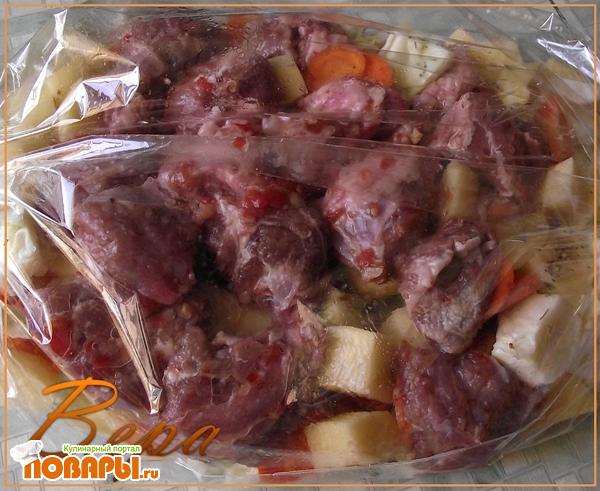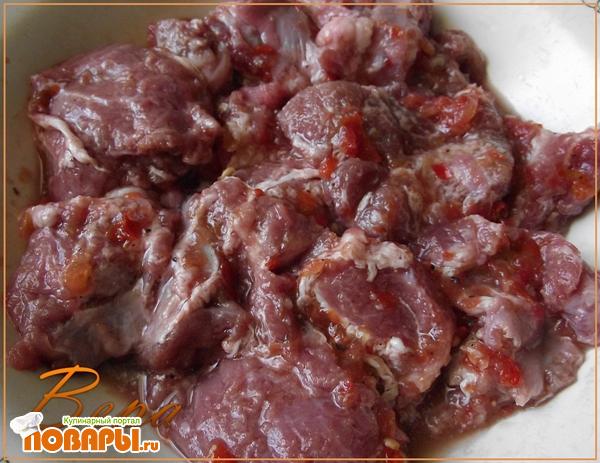 Мясо нарезать крупно, посолить, замариновать в аджике(на пол часа).