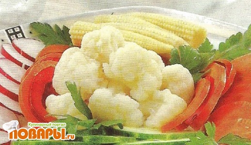 сезонные овощи (морковь, огурцы, сладкий перец, помидоры, редис), маринованные початки кукурузы и цветная капуста 1 кг