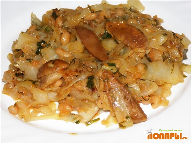 Минут через 10 добавить крупно нашинкованную капусту, посолить, а когда капуста будет почти готова, выложить фасоль. Минут через 5 все это присыпать зеленью и потушить еще минутки 3.