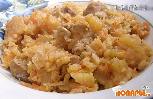 Еще перемешать и варить. Когда закипит засыпать рис и добавить капусту. Довести до кипения посолить, поперчить, приправить, убавить. Перед выключением добавить мясо, перемешать и еще прогреть пару минут.