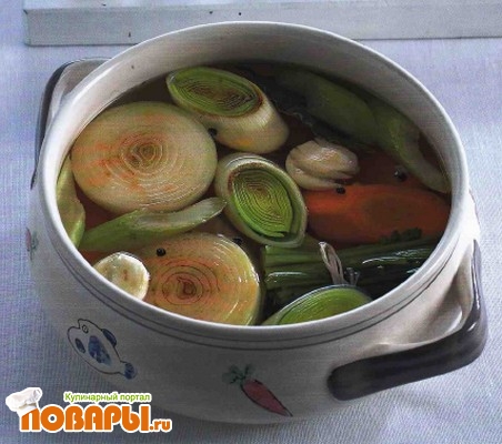 Влейте в утятницу (форму) бутилированную воду комнатной температуры и верните в духовку. Когда вода закипит, при необходимости снимите пену, добавьте зелень, все специи и соль по вкусу.