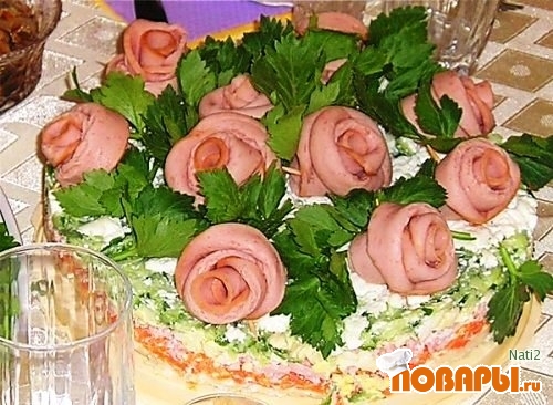 Вылить оставшийся майонез и отправить в холодильник для застывания (я оставляю до утра).Переложить торт на большую,плоскую тарелку. Из колбасной нарезки скрутить розы, закрепить их зубочистками и разложить их на поверхности торта по усмотрению. Листьями торта служит сельдерейная зелень. Нужно постараться ею прикрыть зубочистки