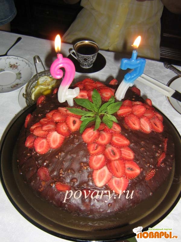 4 ст ложки с горкой сахарной пудры, 50г сливочного масла, 2 ст ложки какао, 100г шоколада, 4 ст ложки коньяка (сцеженного с клубники), 1 ст ложка крахмала