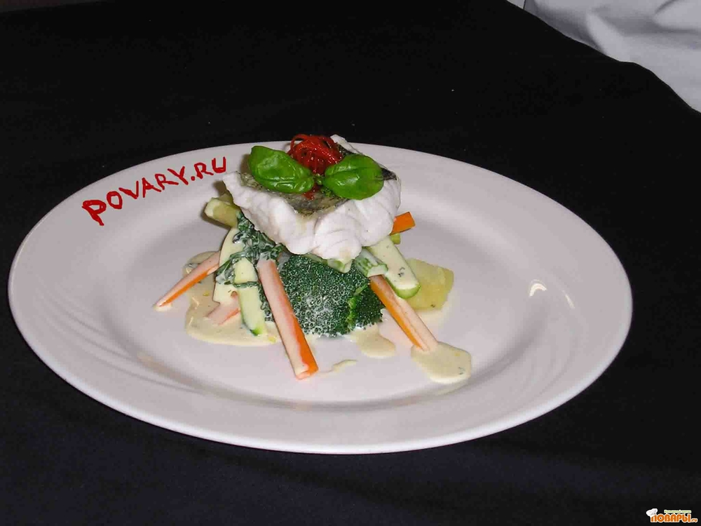 На тарелку выкладываем овощи, ложкой поливаем соусом овощи, на верх кладём филе палтуса. Украшаем листиком базилика и фелированной нарезанной мелким жульеном паприкой, ну или как вам больше нравится.
