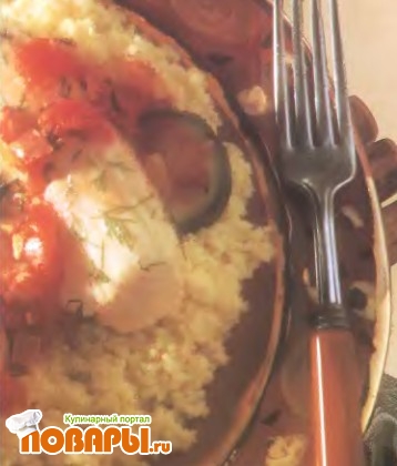 Сместить рыбу к центру блюда, а по внешнему краю выложить кускус. Прогреть, не накрывая, на полной мощности в течение 30 секунд. Накрыть крышкой и дать настояться, прежде чем подать на стол.