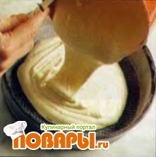 Вылейте тесто в центр смазанной маслом и посыпанной мукой формы (так как тесто жидкое, оно легко распределится по дну формы).