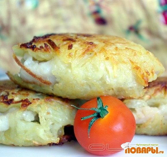 Филе разделать на кусочки, посолить, поперчить. Сырой картофель натереть на средней терке. Смешать с сырыми белками и крахмалом, лишнюю жидкость отжать руками.