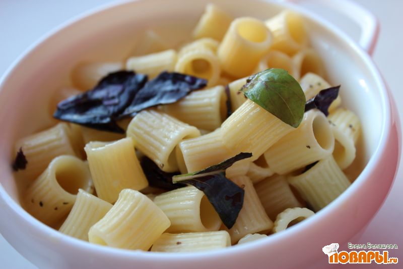 Сливаем пасту, заправляем оливковым маслом, солью, перцем крупного помола, посыпаем базиликом и перемешиваем.
