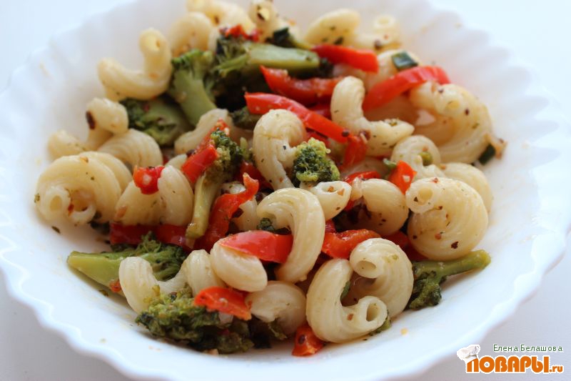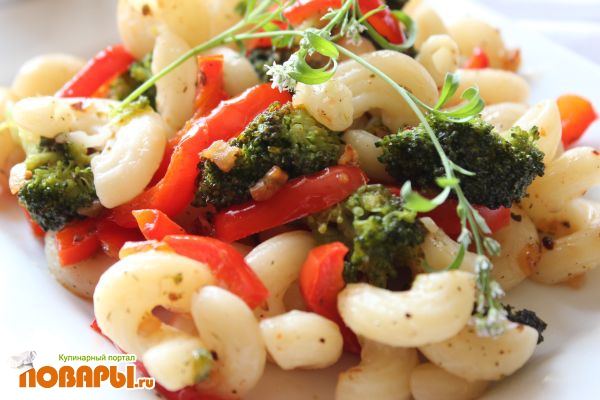 Смешиваем пасту с тушеными овощами и прогреваем минуту-две.