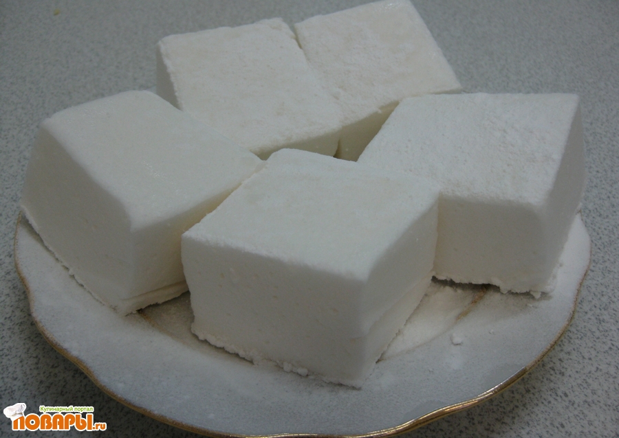 Взбить белки в глубокой посуде, влить туда всю жидкость из кастрюли и взбивать миксером на большой скорости. Когда белки с желатиновой смесью поднимутся, добавить туда ванильный сахар и продолжать взбивать до максимально густой массы. Затем смешать крахмал и сахарную пудру. Взять застеленный бумагой для выпекания и смазанный маслом противень и присыпать его смесью из крахмала и сахарной пудры.