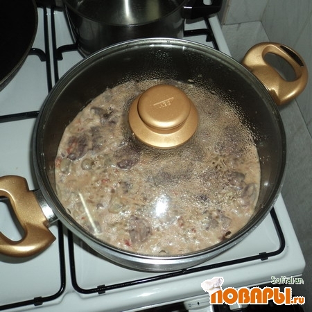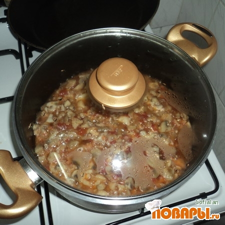 В кастрюлю с растительным маслом выложить лук и чеснок, обжаривать до мягкости лука. Затем добавить шампиньоны, потушить под крышкой 10 минут. Если в кастрюле образуется много воды, то можно снять крышку, пока лишняя вода не испарится.