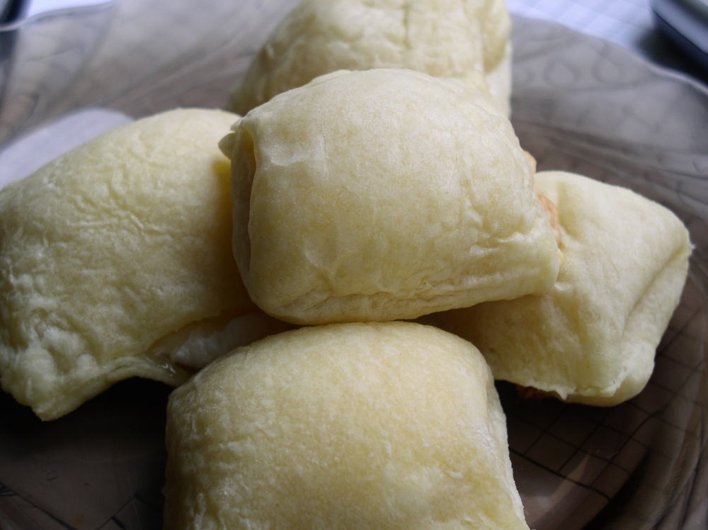 Тесто раскатать в пласт, разрезать на прямоугольники или вырезать кружочка. На каждый прямоугольник положить начинку, свернуть пополам, защепить по краям, свернуть еще раз пополам, защепить края и выложить на смазанный противень.