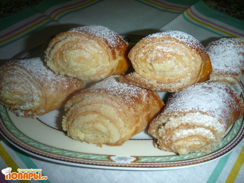 Далее тесто с начинкой плотно сворачиваем в рулеты, слегка натягивая тесто. Готовые рулеты нужно немного приплюснуть ладошками. И разрезать ножом на небольшие трапеции или разрезать кусочками наискосок шириной 3-4 см.