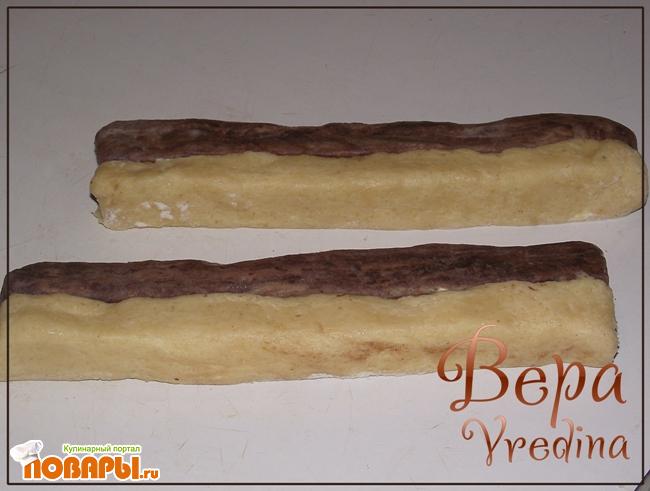Сформировать из теста 2 колбаски(светлую и темную), разделить их пополам.