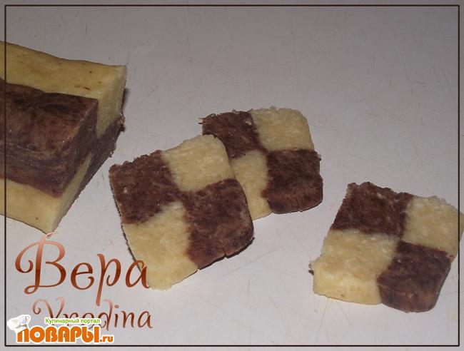 Тесто разделить на 2 части, в одну добавить ванилин, в другую какао.