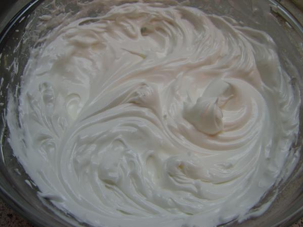Приготовление крема. Взбить охлажденные белки (без сахара) до устойчивых пиков. Поставить миску на паровую баню, продолжая взбивать, всыпать в три приема сахар. Прогревать и взбивать 5-7 мин. В конце добавить лимонную кислоту. Готовый крем охладить.