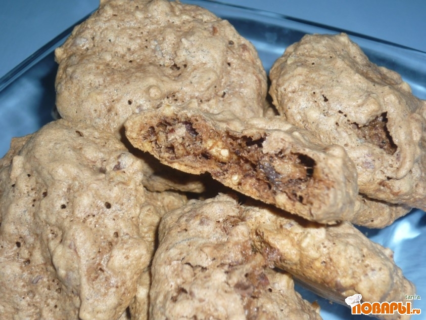 Печенье придумала вдохновившись кокосовыми кучерявчиками. Тот же принцип - взбить белки с пудрой, смешать с сухими ингредиентами, выложить бугорками на пекарскую бумагу и выпекать.