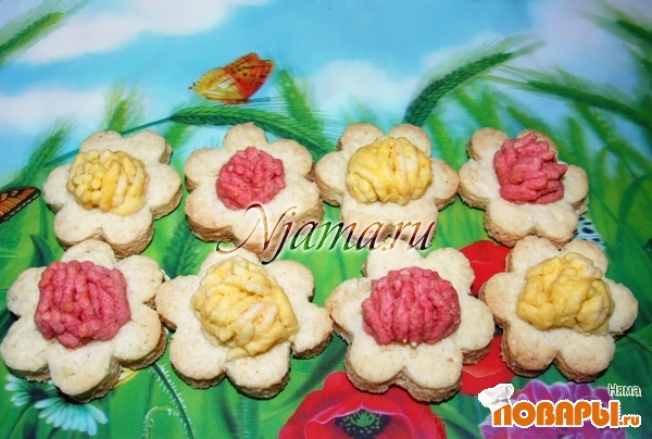 Цветочки укладываем на противень. Отщипываем по кусочку цветного теста и через чеснокодавилку выжимаем в центр каждого цветочка, отрезаем острым ножом.