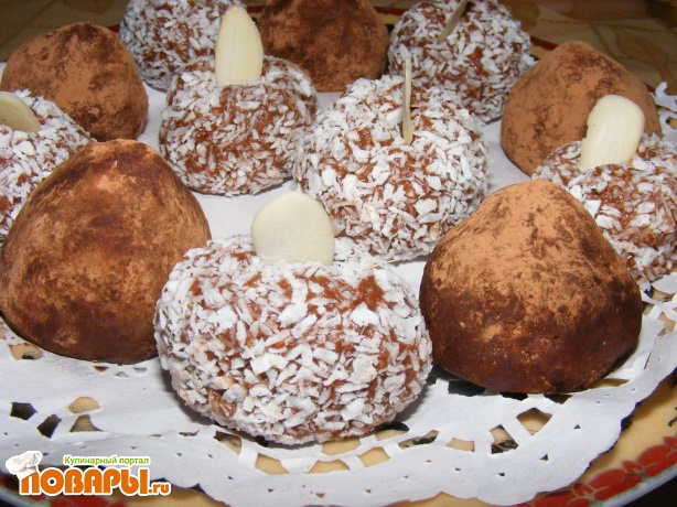 Вынимаем шарики, даем им некоторое время постоять при комнатной температуре, придаем красивую форму, обмакиваем хорошенько в какао, можно в орехах, кокосовой стружке или в шоколаде (можно сделать на палочках, будут кейк-попсы новомодные). Готовые конфетки-печенье ставим в холодильник, через 30 минут можно уже пробовать. Вкусно! Детям очень нравятся, да и взрослым хорошо подойдут к кофе или к чаю))