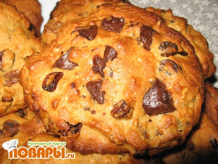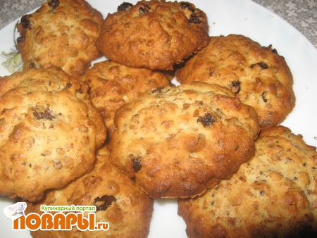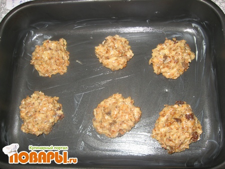 Ввести овсяные хлопья, разрыхлитель, муку и изюм и замесить тесто. По консистенции оно будет похоже на жирную сметану, но со временем станет более плотным, так как хлопья разбухнут. Печенье формируем чайной ложкой, расправляя, если нужно, мокрыми пальцами. Красивых форм особо не получить, так как в составе есть изюм. Главное, делать печенье не толстым - не более 5мм толщиной.