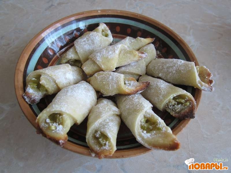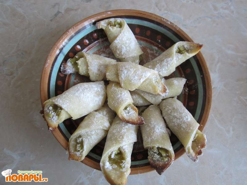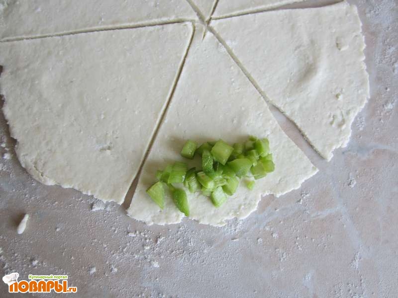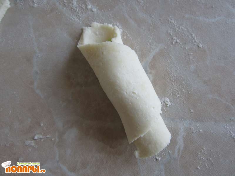 Дальше вынимаем тесто из холодильника и раскатываем. Потом разрезаем на кусочки.
