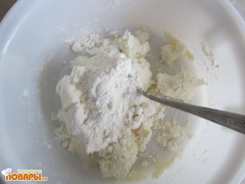 Делаем тесто: берем творог, добавляем в него сахар, ванильный сахар и тщательно перемешиваем, потом постепенно добавляем муку и тоже все тщательно перемешиваем.