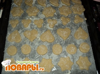 Раскатываем его, на посыпанном мукой, столе (толщиной около 0,5 см). Вырезаем кружочки стаканом или разные фигурки формочками. Выкладываем фигурки на смазанный маслом противень, слегка смачиваем верх водой и посыпаем сахаром (я еще посыпала кунжутом, думаю много чем можно - все зависит от ваших пристрастий).