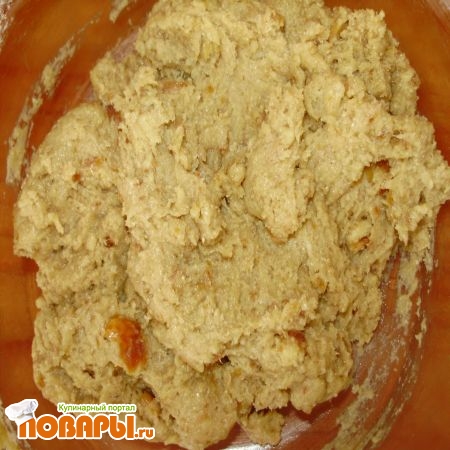 В чашке смешать финиковое пюре, сухую смесь и масло.