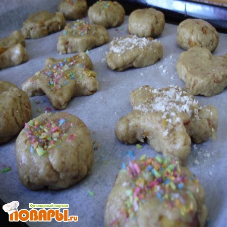 Вылепить печенье: круги, сердечки, звездочки, палочки, колбаски, кренделя. Форма на усмотрение. Сверху присыпать стружкой, семенами.