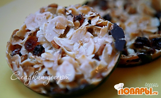 Отдельно в любой ёмкости перемешать изюм. орехи, курагу (чернослив), миндальные листья...залить их тёплым мёдом и перемешать равномерно.