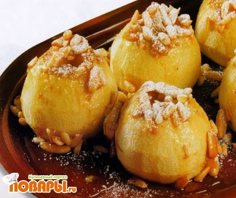 Перелейте выделившуюся при запекании жидкость вместе с орехами в кастрюльку и варите, пока не загустеет. Полейте сиропом яблоки и посыпьте сахарной пудрой, пропуская ее через сито. Подавайте горячими.