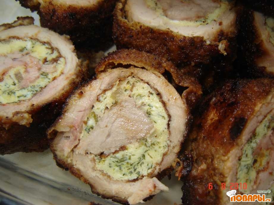 На мясо выложить куски омлета (порезанные по размеру) и свернуть плотными рулетами. Рулеты сколоть зубочистками или перевязать кулинарной нитью. Запанировать их в муке, яйце, сухарях и обжарить на растительном масле со всех сторон.