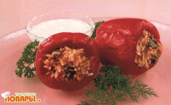 При подаче перцы выложите на блюдо, оформите зеленью. Соус подайте отдельно.