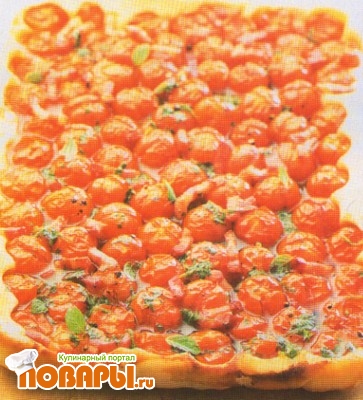 Раскатайте тесто на столе, слегка присыпанном мукой, в прямоугольник размером с жаровню. Накройте тестом помидоры, подворачивая края теста внутрь жаровни, и выпекайте 20-25 мин, пока тесто не станет хрустящим и румяным.