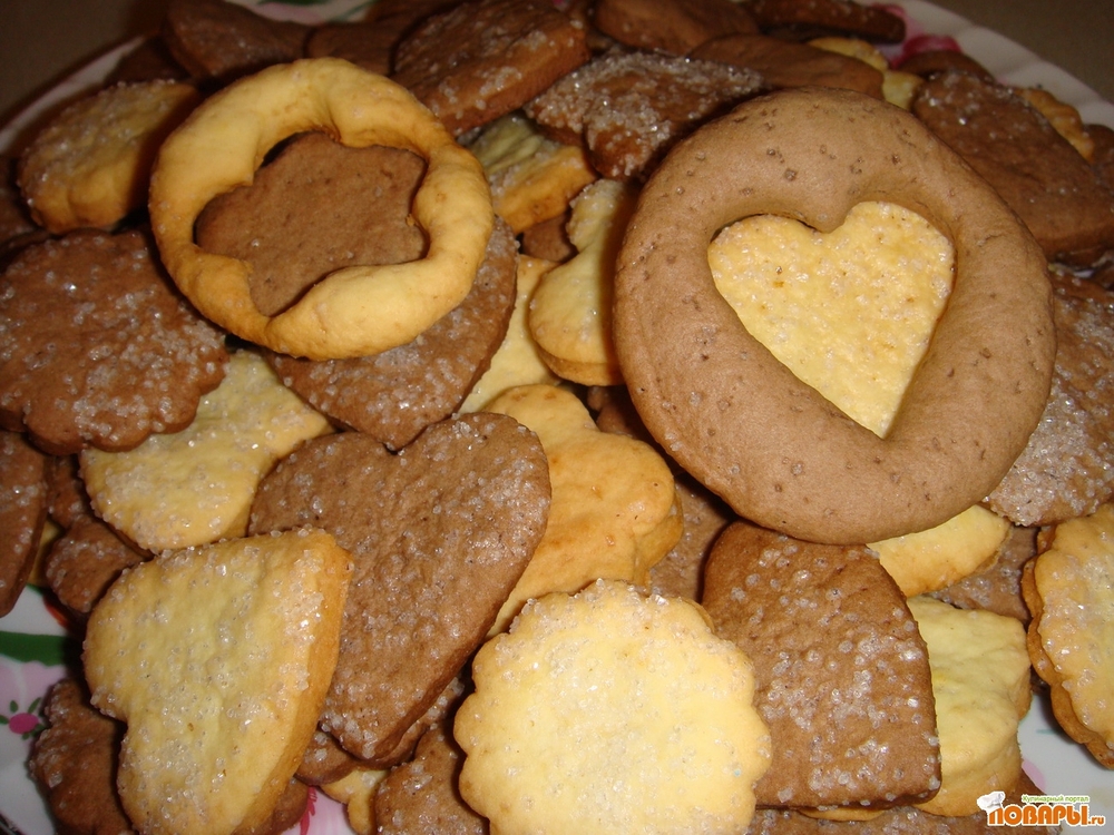 Разделить на 2 части тесто, в одну добавить какао. Замесить тесто, поставить в холодильник на 20-30 минут. Достать, раскатать и вырезать специальной формочкой для печенья фигурки.