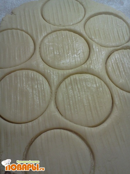 На столе, присыпанном мукой, раскатываем тесто в пласт толщиной около 6 мм. С помощью формочек или круглой посуды вырезать коржики (у меня около 8 см в диаметре). Можно сделать и печенье из такого теста.
