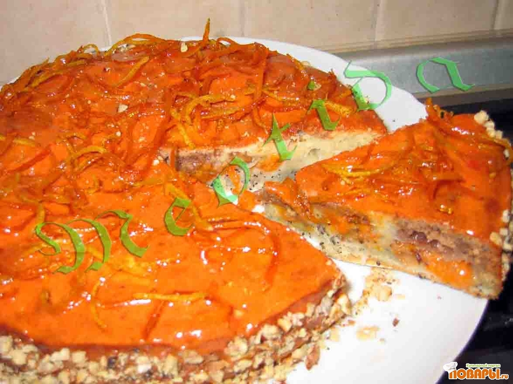 украсить верх и бока пирога абрикосовой пенкой (закрывала варенье и осталась пенка) или джемом (будет слаще).