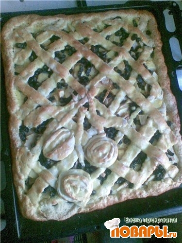 Пока режем начику. Затем раскатать пласт,толщиной примерно 1,5-2 см.На него выложить начинку и сверху украсить полосами из теста.