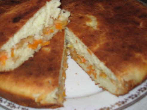 Я сделала правда сладкий пирожок, т.е в тесто добавила 1 ст.л. сахара и начинку сделала сладкую: морковь с яблоком натерла на терке. Сверху начинку залить второй половиной теста и поставить в разогретую духовку на 30-40 минут. Как только вверх зарумяниться можно подавать на стол.