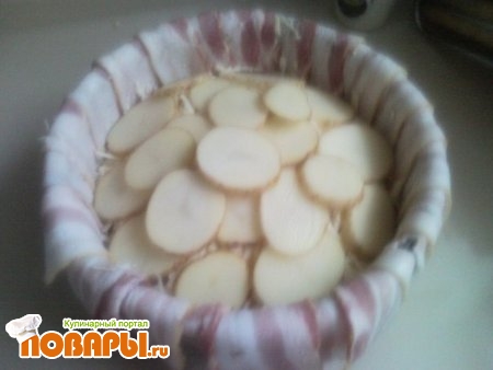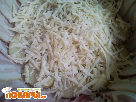 На дно кладем небольшой слой порезанного кольцами картофеля, сверху засыпаем слоем тертого твердого сыра.