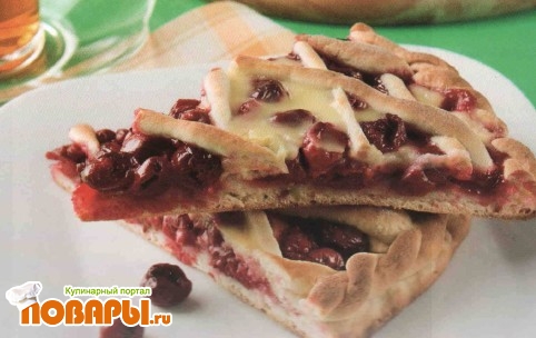 Из оставленного теста скатайте тонкие жгутики, уложите их в виде сетки на вишню и выпекайте пирог при 200 °С почти до готовности.