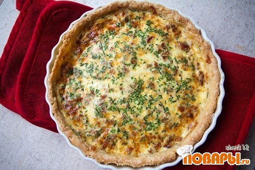 Положите бекон с сыром на нижнюю часть пирога. Взбейте яйцо, молочную смесь снова в течение нескольких секунд, а затем вылить ее аккуратно сверху сыра и бекона. Прямо в форме можно перемешать для равномерного распределения сыра, бекона и лука в пироге.