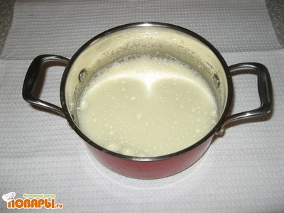 Добавляем растопленное и охлажденное сливочное масло. Всё тщательно перемешиваем и вливаем в эту смесь молоко.