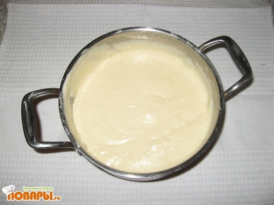 В отдельной миске перемешиваем муку и разрыхлитель. Всыпаем полученную смесь в кастрюльку с тестом, перемешиваем аккуратно ложкой, а потом взбиваем миксером минуты две.