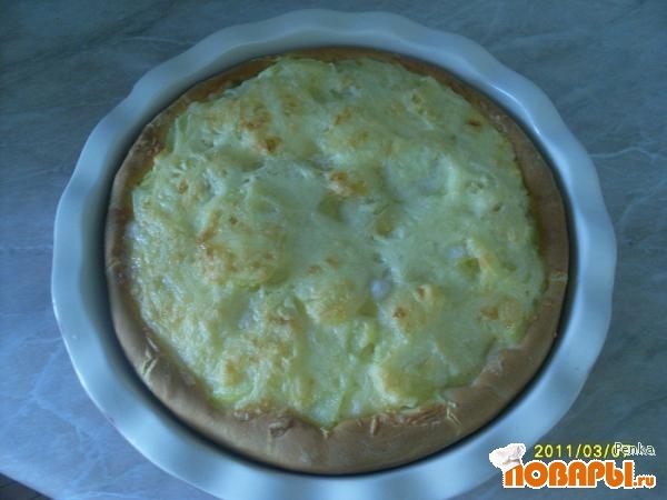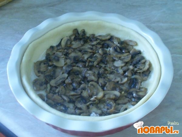 Тесто раскатать тонко, примерно 3 мм. Выложить в форму с бортиками и немного смазать сметаной.