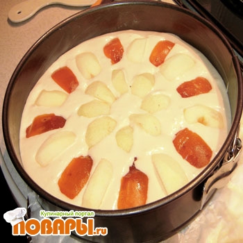 Вылить тесто в предварительно нагретую форму, и лучше застелить его бумагой для выпечки. Дольки яблок и хурмы, просто "утопить сверху".