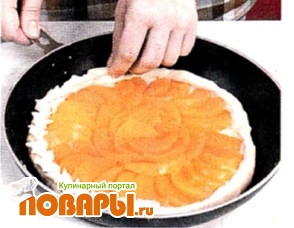 Нарезанные персики плотно уложить на поверхность будущего пирога так, чтобы одна долька перекрывала другую.