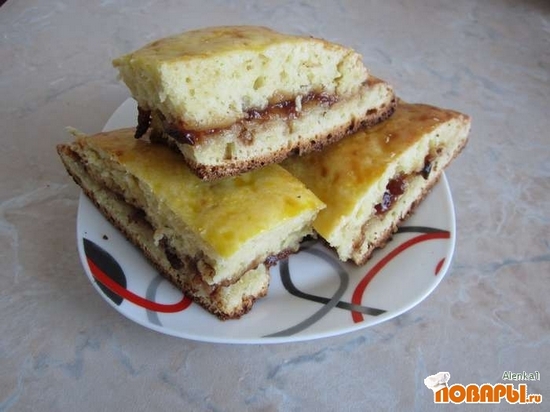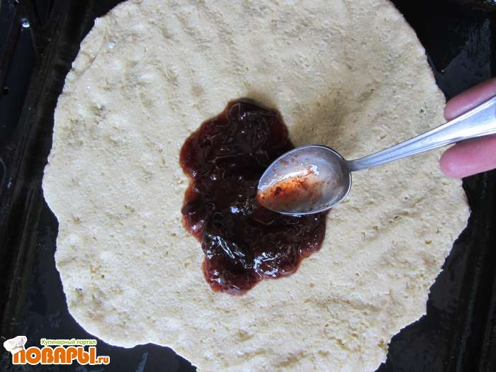 Дальше смазываем растительным маслом противень и выкладываем на него половину готового теста, разминаем до толщины около сантиметра и выкладываем сливовое варенье.