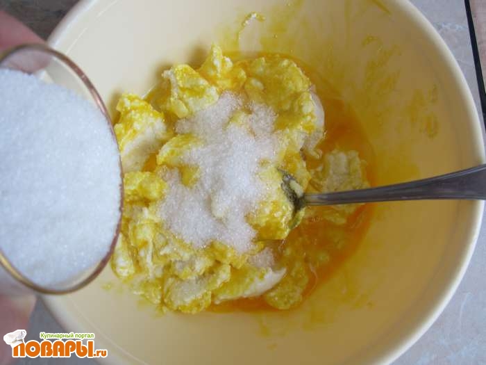 Берем творог и добавляем в него 3 яйца, все тщательно перемешиваем. В полученную массу добавляем сахар и ванильный сахар, опять все перемешиваем.